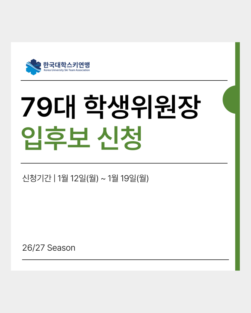 본 연맹은 제79대 한국대학스키연맹 학생위원장을 선출하기 위해 아래와 같이 공고합니다.