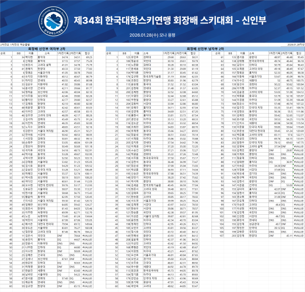 | 대회명 | 제34회 한국대학스키연맹 회장배 스키대회 신인부 | 작성일 | 26-02-02 17:09 |