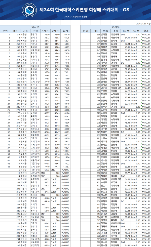 제34회 한국대학스키연맹 회장배 스키대회 GS 결과입니다.