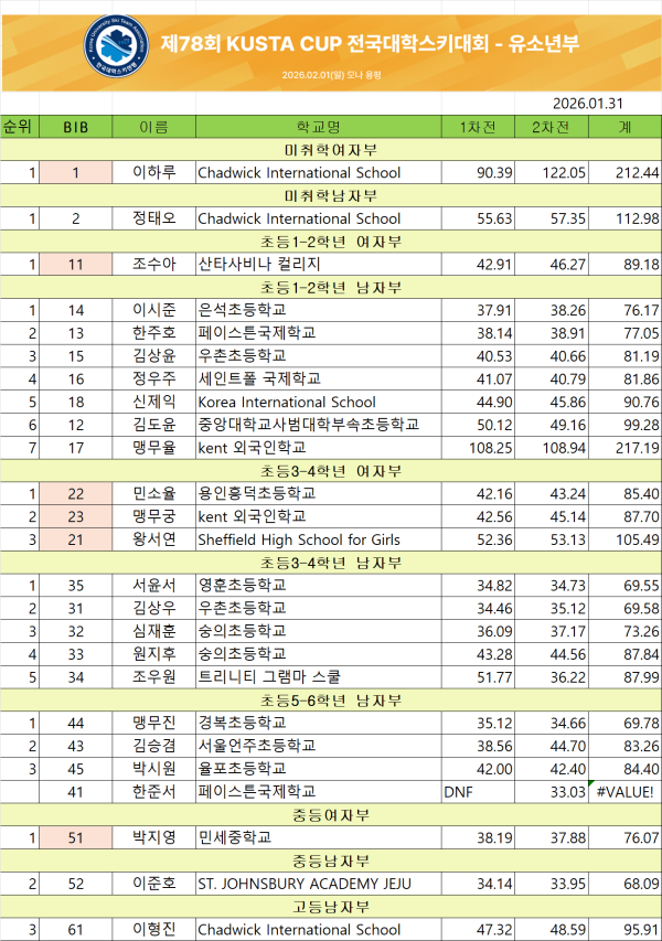 제78회 KUSTA CUP 전국대학스키대회 유소년부 결과입니다.